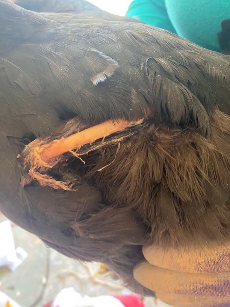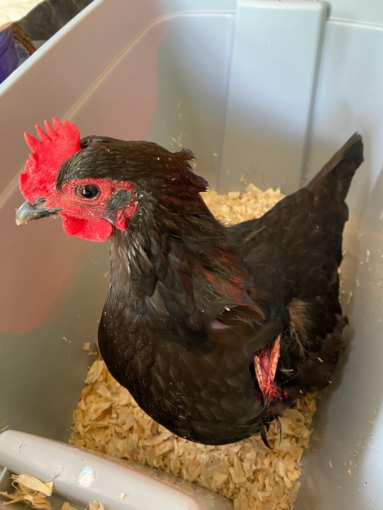 We have a fox who likes to roam in our yard. We were fine with this as long as he minded his business. Sadly, he could not keep his end of the bargain. Our fox has a taste for chicken wings. Somehow, he got ahold of Louise and took a chunk out of her side. I found her when no one was home and was heartsick. After a pep talk from my sister and a trip to Tractor Supply, Louise entered my makeshift ICU. It’s been 2 weeks and I am doing my best to play the part of veterinarian (a stretch to be sure!) and we are hoping she will somehow be able to grow enough new tissue to cover her protruding bone. **warning …the pictures may be icky to you**
