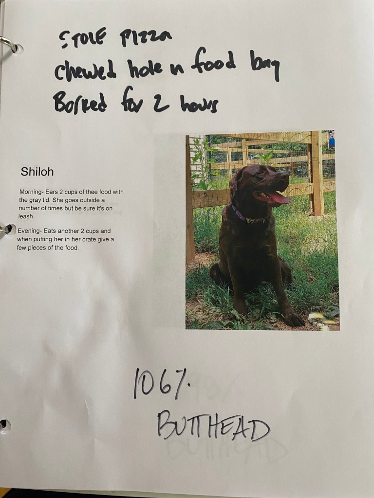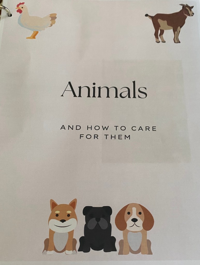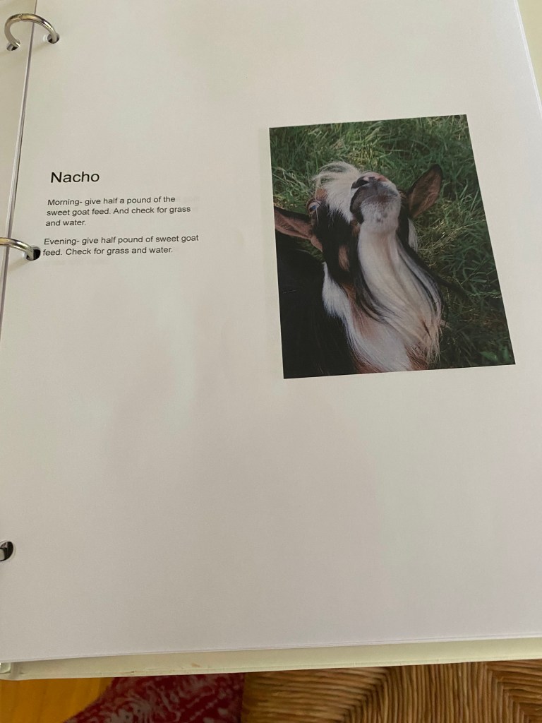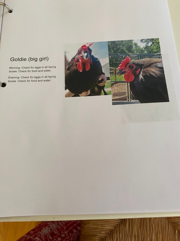 In preparation for Farm Girl and I leaving the guys in charge of all the farm animals for 2 weeks, Farm Girl made an instruction binder. There was a page for each animal on the farm. It included the animals name, a picture, and instructions for their care. Farm Girl was a little worried that her Dad and brother would not take adequate care of her beloved animals while she was away. We returned in the wee hours this morning to hand written reports of each animal. Everyone misbehaved but they were all well cared for.