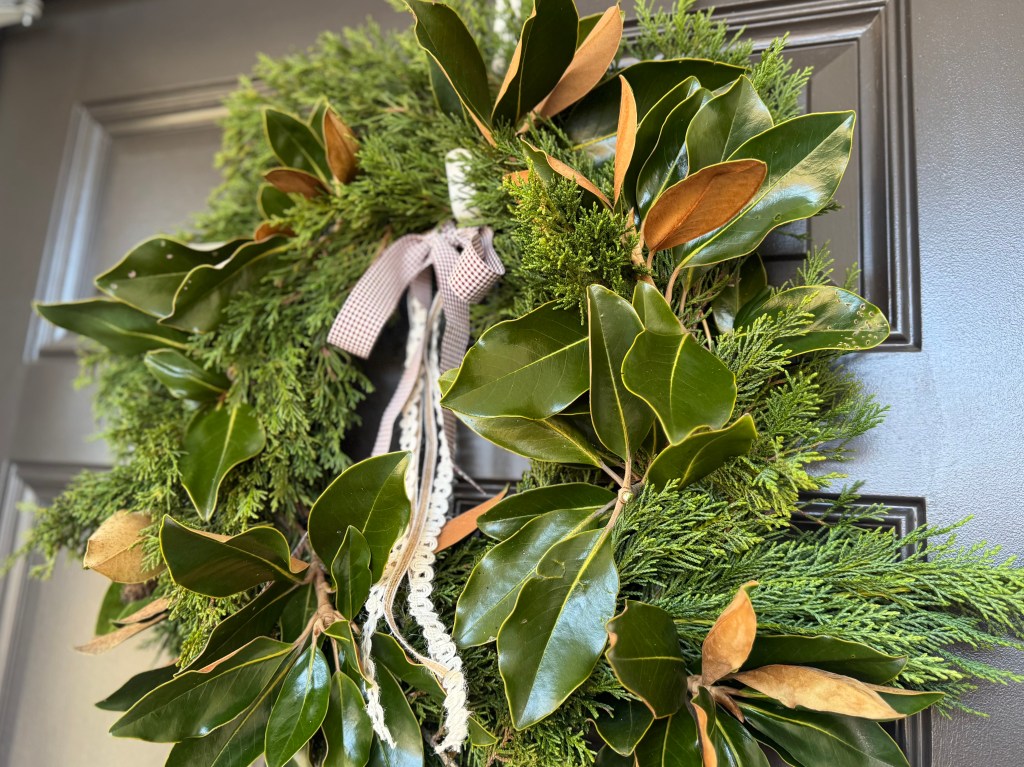 It seemed a shame to waste all the boughs stripped from the tree that the bear left behind, so with a little help from our magnolia tree, those stripped boughs became our holiday wreath this year.
