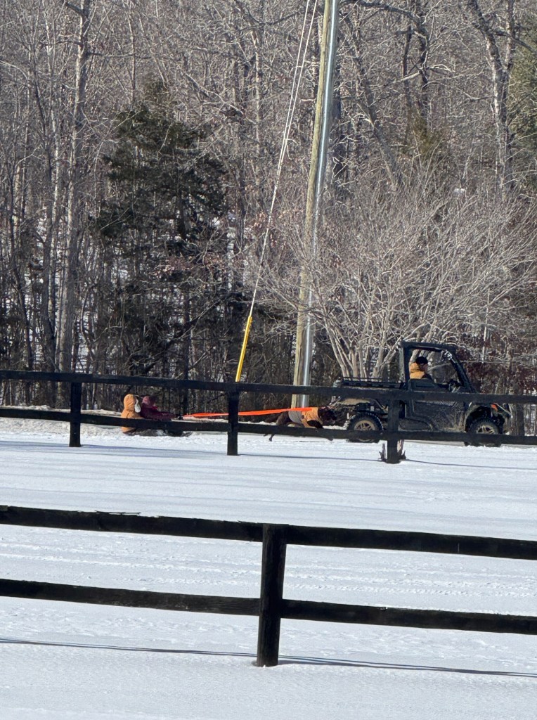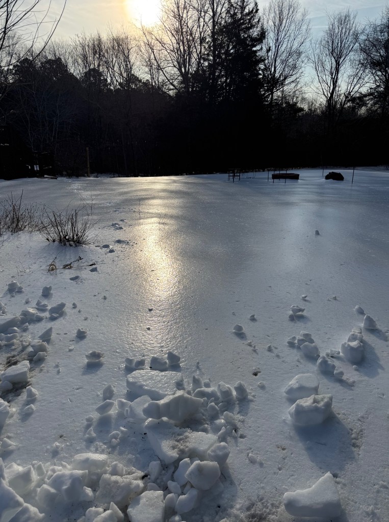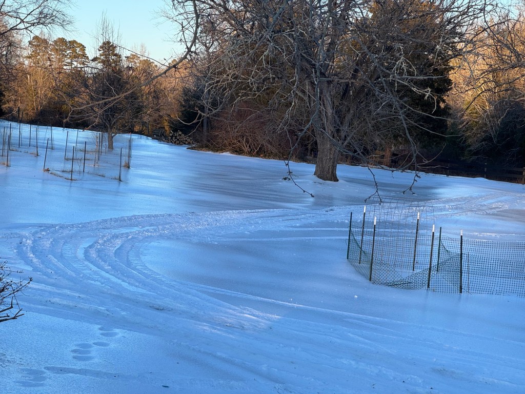 Weatherman had been hyping up a recent storm as a possible ice storm, so we took them seriously….we still have memories of a week without power in the Midwest after an nasty ice storm 20+ years ago. We did lots of prep so that animals would have what they need and we would too. The freezing rain missed us (hurray!) but we ended up with 5 inches of snow covered in several inches of sleet. This quickly turned our snow into a five inch block of ice or “snowcrete” as everyone began to call it. It was no joke. Plowing and shoveling it was almost impossible. We had a week of no school and staying at home. Walking out to feed the animals was taking your life in your hands and we dubbed the farm the Grawly Bear Ice Rink. We did find the ice rinks made for really good, fast sledding! With lots of chilly temps, the icy stuff has stuck around for 2 1/2 weeks. Even Farm Girl is ready for some patches of grass!